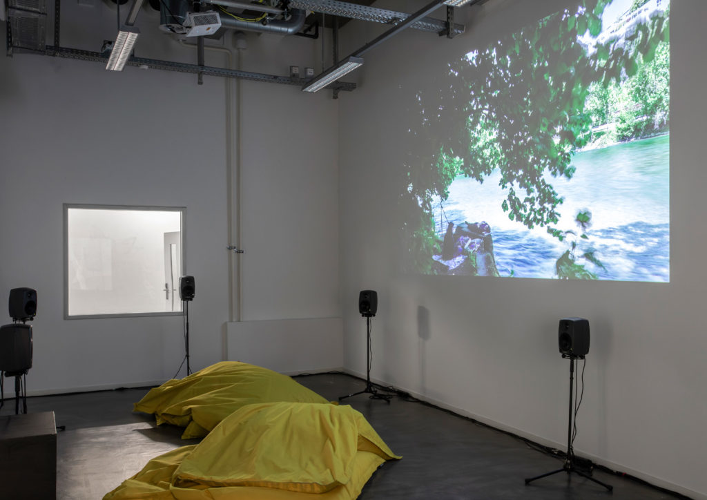 Die Installation läuft durchgehend. Besuchende können sich hinsetzen oder -legen und zuhören, so lange sie möchten.